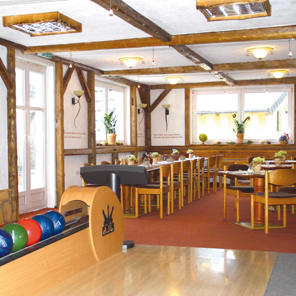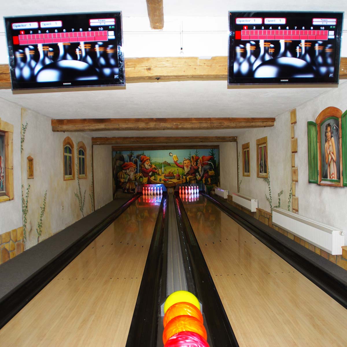 Bei uns können Sie sogar vor, nach und bei einem leckeren Mahl aktiv sein. Gleich neben der urigen Bauenrstube im Haus „Spitzbergblick“ finden Sie eine moderne Doppelbowlingbahn mit Bowlingstube und Theke für bis zu 30 Personen. Natürlich vergessen wir als familienfreundliches Haus die Kinder nicht – so gibt es eine Kinderbahn mit druckbetriebenen Sicherheitsleisten für glückliche Kinderherzen.