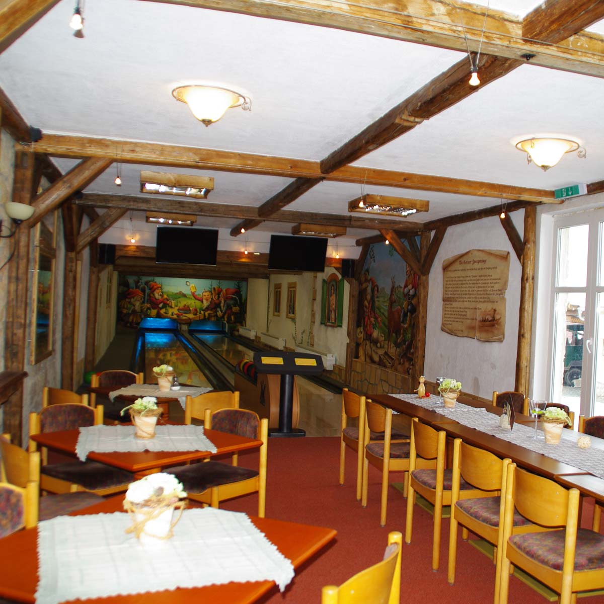 In rustikaler Atmosphäre und mit einer besonderen Wandbemalung zur ortsansässigen „Zwergensage von Cotta“ spielt es sich gleich viel besser. Ob in zünftiger Vereinsrunde, zu Geburtstagen, Weihnachtsfeiern oder einfach einmal in Familie, mit den vielfältigen Spielprogrammen ist der Spaß garantiert. Sollte dann doch der Magen knurren – auch hier ist Menü / Buffet und Service kein Problem!
