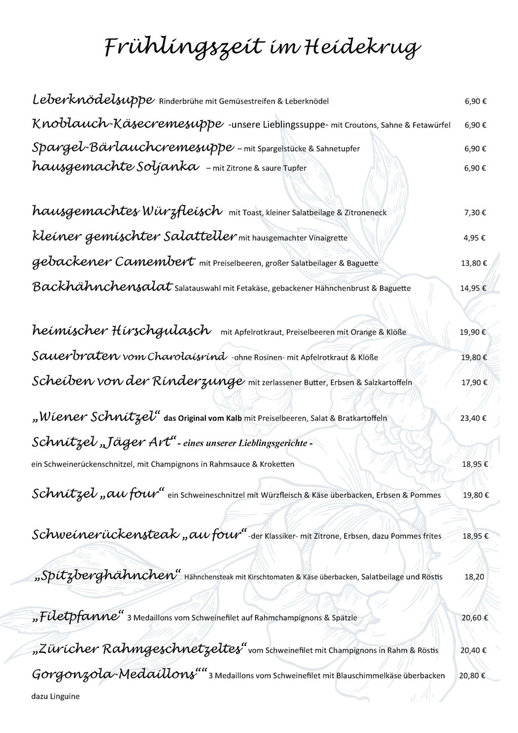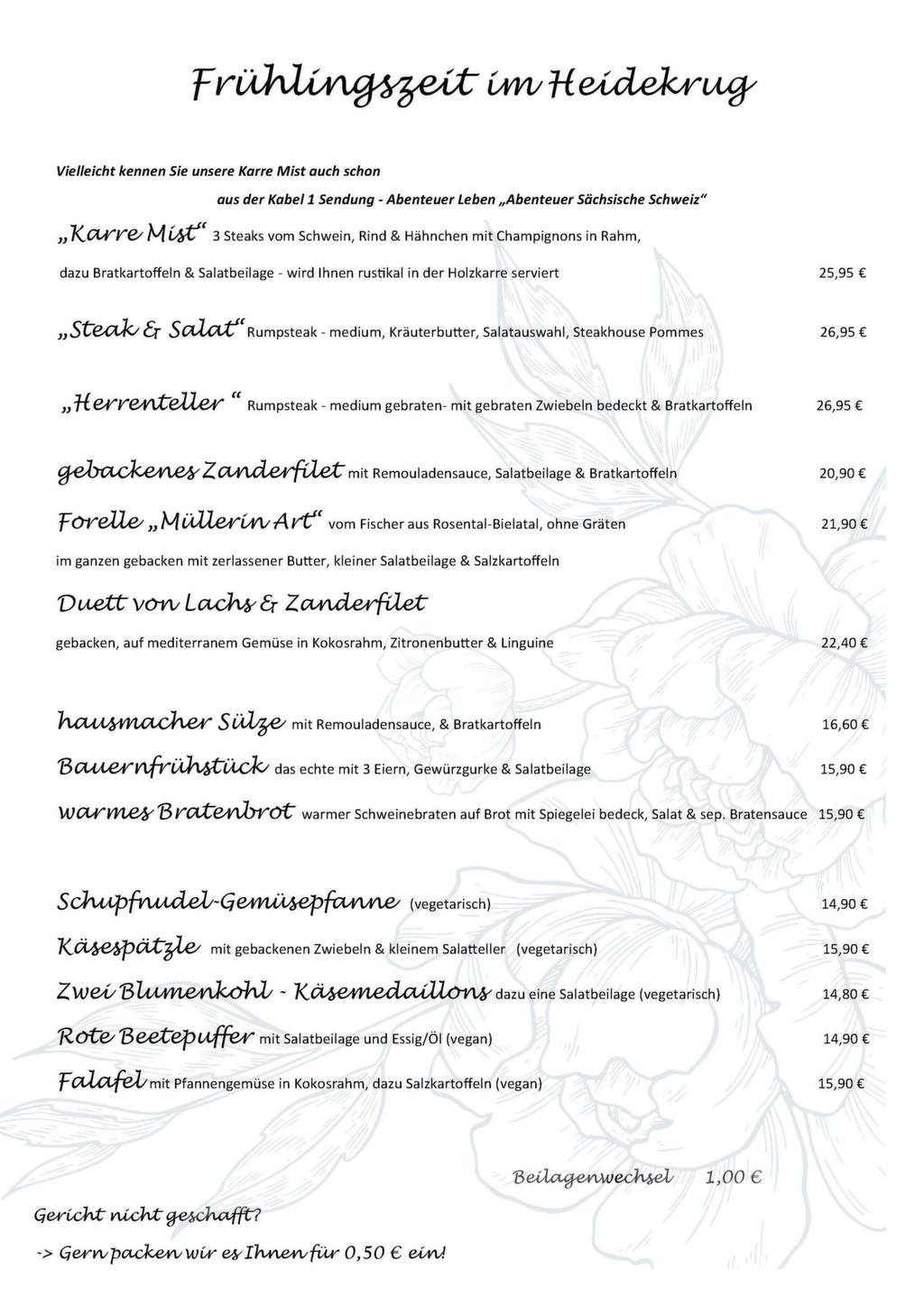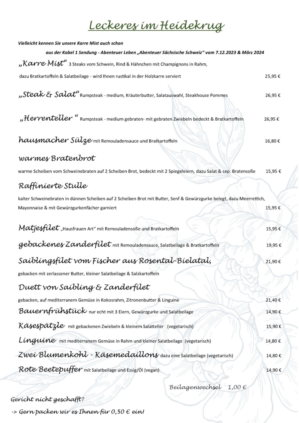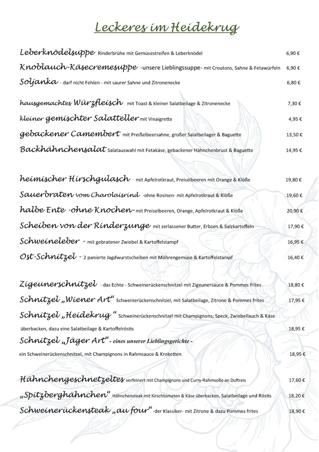Schon ein schönes Sprichwort sagt »Liebe geht durch den Magen« – wir halten uns daran und verwöhnen Sie gern mit unserer großen Speisenauswahl in einer historischen Karte.